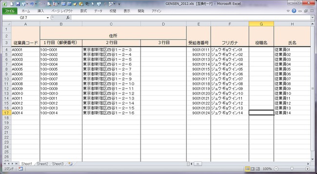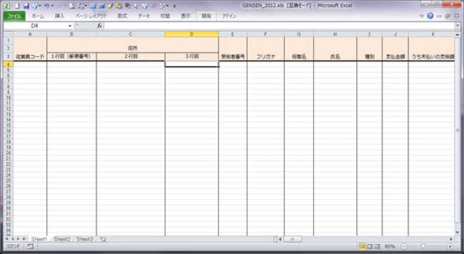 源泉徴収票雛形ファイルを取込用CSVファイルに編集します。