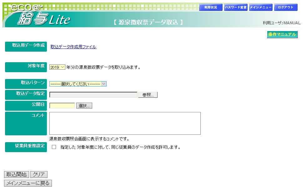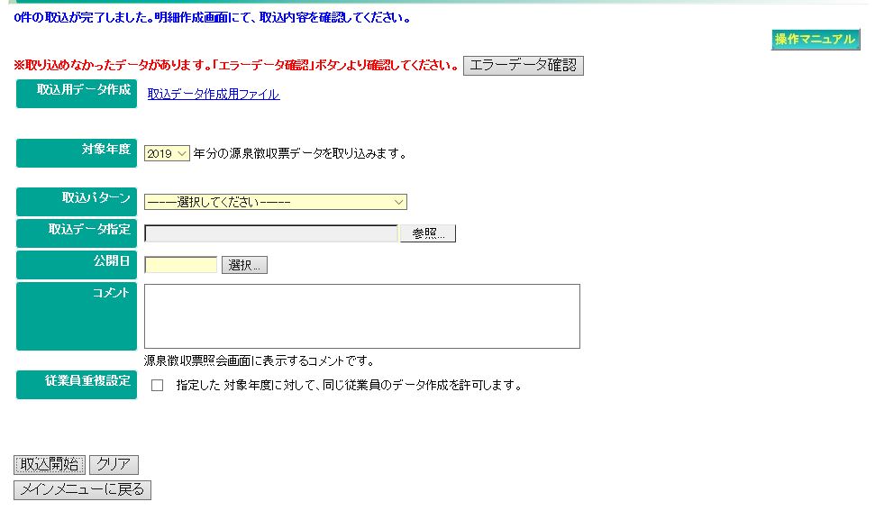 | 取込データ指定 | - | 源泉徴収票を作成するために編集・保存した、源泉徴収票データのCSVファイルを指定してください。 |